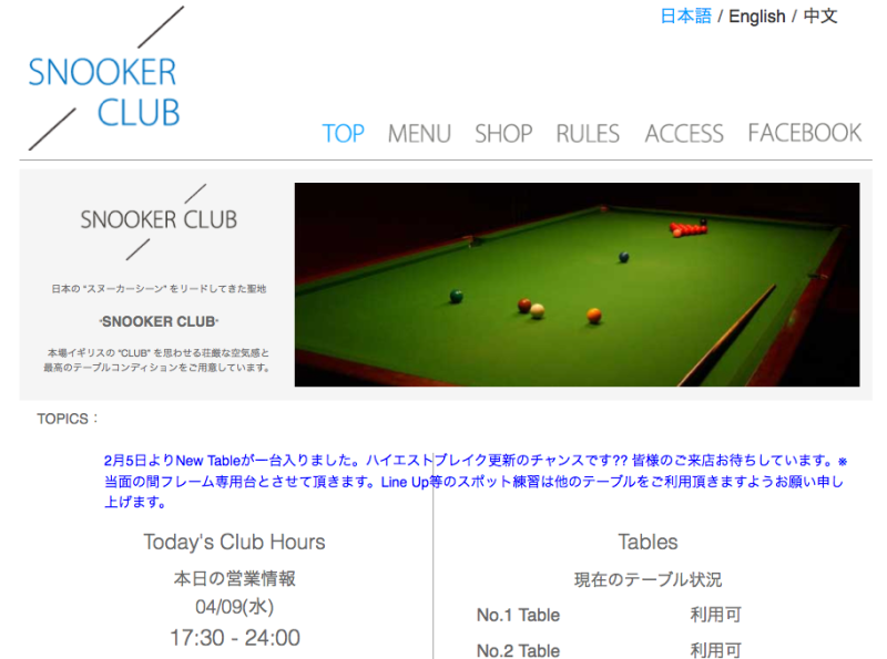23区内で唯一スヌーカーをプレイできるクラブ、”SnookerClub”のWebサイト、Facebookページ制作、及び店舗コンサルを担当。